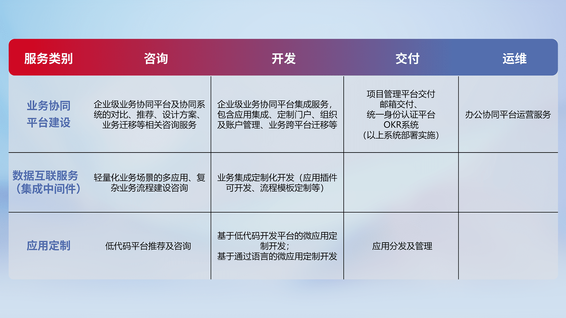 针对钉钉、、企微、、、IDaas等平台级产品提供产品的规划、、、、方案、、交付、、、定制化开发等服务,,,实现如统一协同办公、、智能客户服务、、、混合会议管理、、、、智能数据查询、、、、等业务场景,,,实现数字化转型。。。。