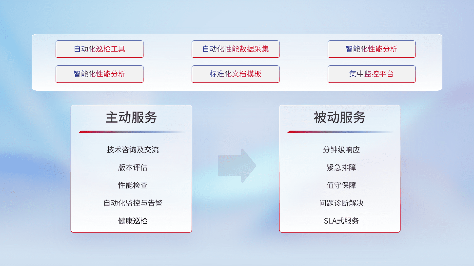 智能化工具和标准化文档,,保障服务质量,,,,提供主动服务(包含技术咨询、、版本评估、、、、性能检查、、、、自动化监控与告警、、健康巡检)和被动服务包含(分钟级响应、、、、紧急排障、、、值守保障、、问题诊断解决、、、、SLA服务)。。