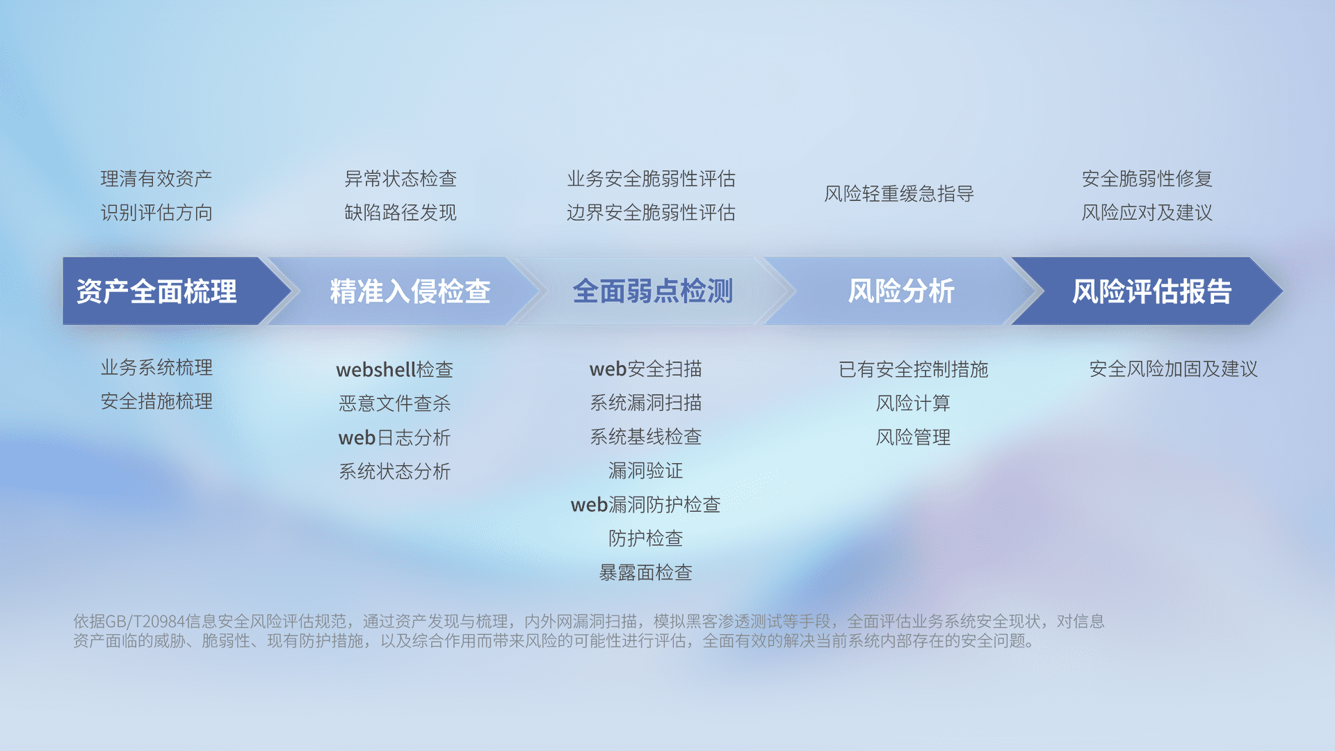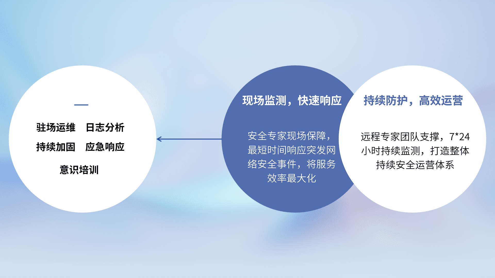针对客户行业特性,,,,以专业的安全服务+多厂商联合解决方案提供专属的一站式安全管理服务,,,帮助客户全面感知网络空间威胁,,,基于识别、、、检测、、、、分析、、、防护、、监测、、、、响应的服务理论模型,,,从方案咨询、、集成交付、、、、评估验证、、优化加固、、运维运营,,致力于为客户提供完整的闭环管理式安全服务。。。。以实战经验为客户打造高抵御风险的安全体系,,帮助客户发现威胁、、、对抗威胁、、、、处置威胁,,不断积累安全对抗能力,,,,持续保障数字化安全。。